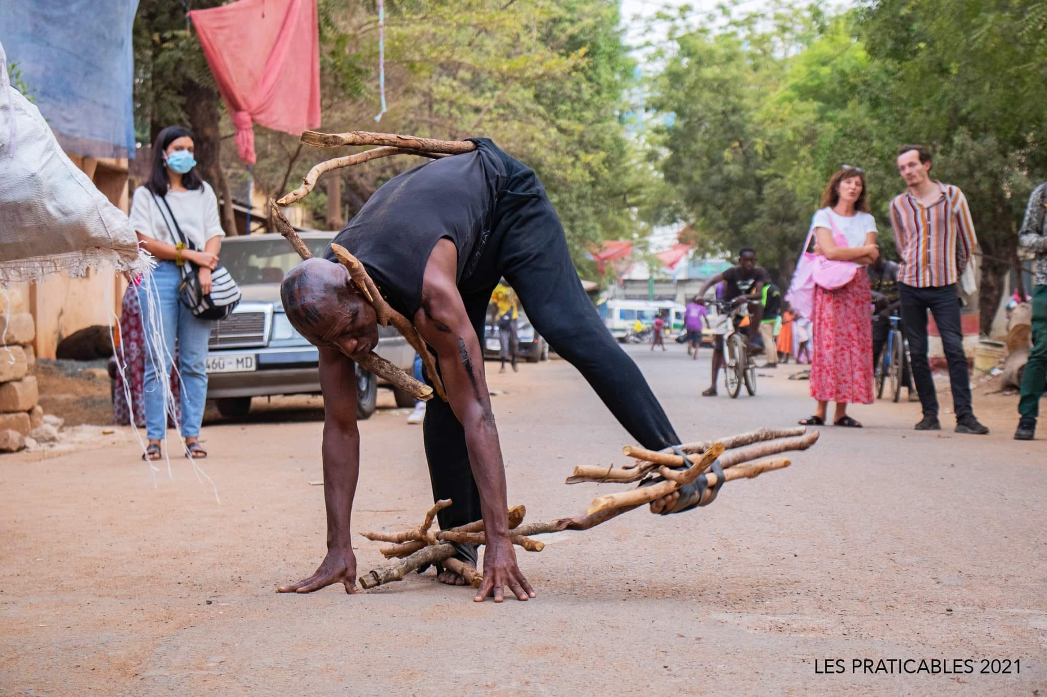 D’étranges êtres humains surgissent actuellement de manière inattendue, vous surprenant au coin d’une rue du quartier de Bamako-coura. Au bord du goudron, un jeune homme ébouriffé, au lourd collier formé par deux pneus de voiture, pieds nus, énumère à voix forte et sans relâche, face à un miroir, ce qu’il a vu au bord des routes. Une femme ployant sous un énorme sac rempli de chaussures arrivant du lointain marche, harassée et déterminée, vers un autre horizon. Elle nous regarde. Nous provoque. On ne dit rien. Elle continue son chemin. Un homme couché immobile sur une planche maintenue entre deux chaises subit des vicissitudes : on parsème son visage et son torse de poussière, on vient racler son corps avec les dents d’un râteau rouillé, on lui pose ce qui pourrait ressembler à une grosse pomme de palmier hérissée de pointes de bois sur le ventre, on vient tordre une plaque de métal pour faire résonner à ses oreilles le tonnerre d’une déflagration… Il ne bouge pas. À côté de lui un autre, jambes en l’air, tourne indéfiniment comme une toupie lente autour de sa tête vissée dans un casque… Ce ne sont pas des créatures venues d’ailleurs, mais nos sœurs et nos frères qui ont traversé les misères du monde. Et ils viennent raconter leur voyage ici, aux Praticables, mais sans discours. Juste par la force des images qu’ils composent avec leurs corps – engagés, souffrants, magnifiques. Ce sont les performances issues du laboratoire encadré, animé, énergisé par le congolais Erick Androa Mindre Kolo et le camerounais Zora Snake. La femme portant les chaussures sur son chemin de poussière, c’est Sylvie, qui a réellement effectué le voyage à pied d’Abidjan à Bamako au moment de la guerre civile dans son pays. Sa performance s’appelle La marche infernale. L’homme de la planche, à qui Snake demandera de se lever et de plonger la tête dans un seau rempli d’eau et de s’y ébrouer jusqu’à ce qu’il soit vide, c’est le migrant coincé sur une étroite couchette, fuyant le fracas de la guerre et traversant déserts, fleuves et mers. Une des performances s’appelle Liberté, mais la plupart pourraient porter ce titre, tant les contraintes qu’on s’inflige deviennent, pour l’artiste lui-même, travaillant sur lui-même, les outils de sa libération. Au-delà du symbole qu’il représente, au-delà du message dont il est porteur, le sens est alors l’artiste lui-même. Il est saisi dans le processus de transformation de la vie, faite le plus souvent de poussière et de boue, de merde et de sang, en une forme dont la beauté et la vérité sont indémêlables – une œuvre d’art, dont la matière est le corps de l’être humain, dans sa présence misérable et grandiose, dans l’expression qu’il offre de toute la condition humaine. Snake m’apprend que l’homme de la planche était il y a peu un spectateur d’une performance à Bamako. Impressionné, il a voulu tenter l’expérience. Et Snake lui a répondu, comme à chaque fois en la même circonstance : « Si tu veux faire, viens. » Ce sera pour aujourd’hui notre devise des Praticables.