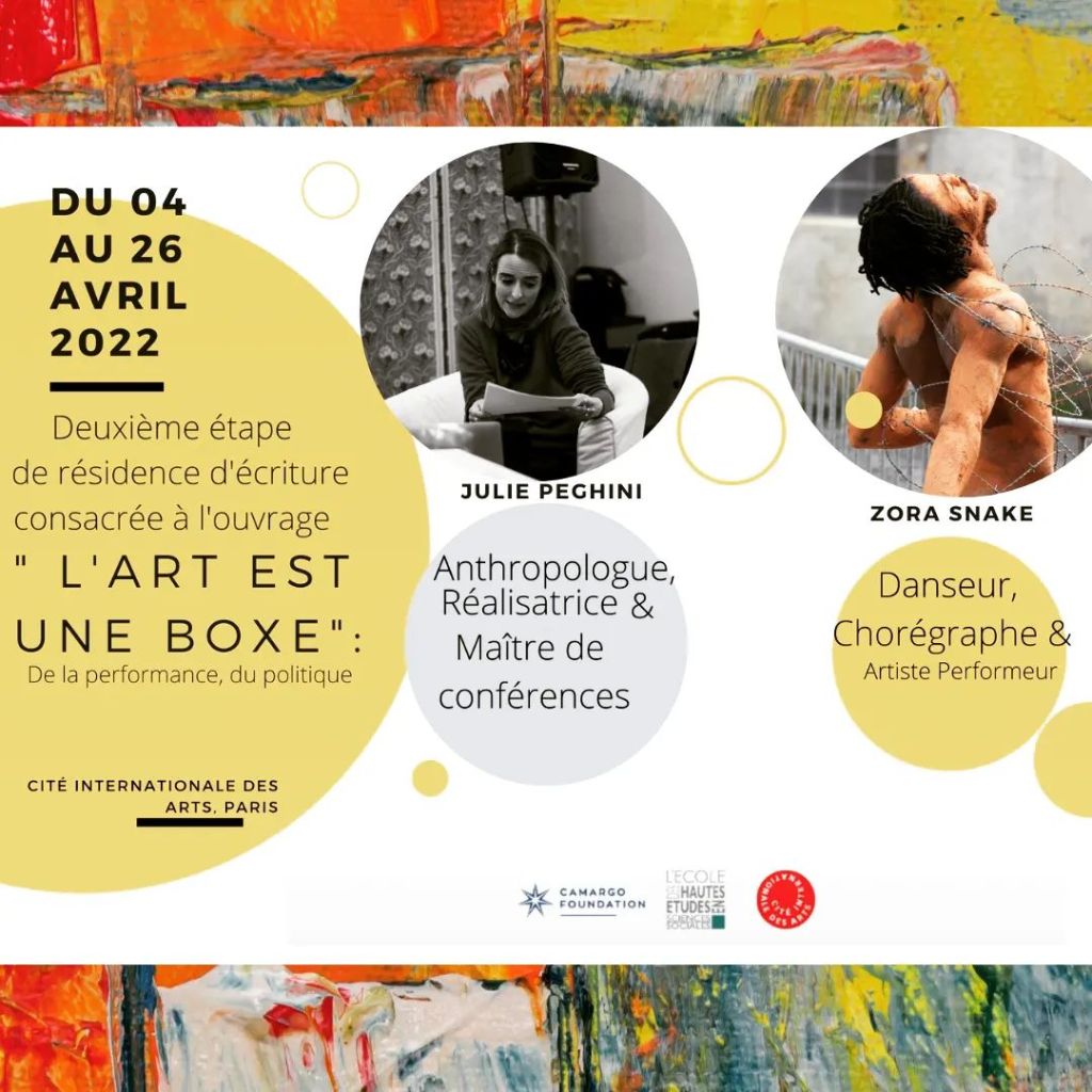 Avec le soutien de la Fondation Camargo (Cassis), L’EHESS (l’école des hautes études en sciences sociales) et la Cité internationale des arts à Paris, L’association la Cie ZORA SNAKE du Cameroun.