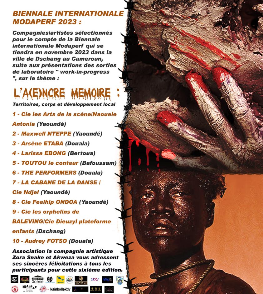 L’année 2022 a été consacrée au laboratoire de recherche artistique et d’invention de nouvelles esthétiques en collaboration avec les historiens, scientifiques, professeurs d’université, directeurs et patriarches de musées de la ville de Dschang. Cette étape de laboratoire avait pour objectif d’enrichir la thématique pour notre future biennale. En novembre 2022, les artistes ont présenté une courte forme de leur projet sous forme d’un « work-in-progress » dans leur espace au choix, dans le but d’une éventuelle programmation sélective pour la prochaine Biennale dont la plateforme est prévue du 15 au 20 novembre 2023 dans la ville de Dschang, sur le thème : L’A(E)NCRE MEMOIRES : Territoire, corps et développement local.
