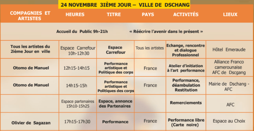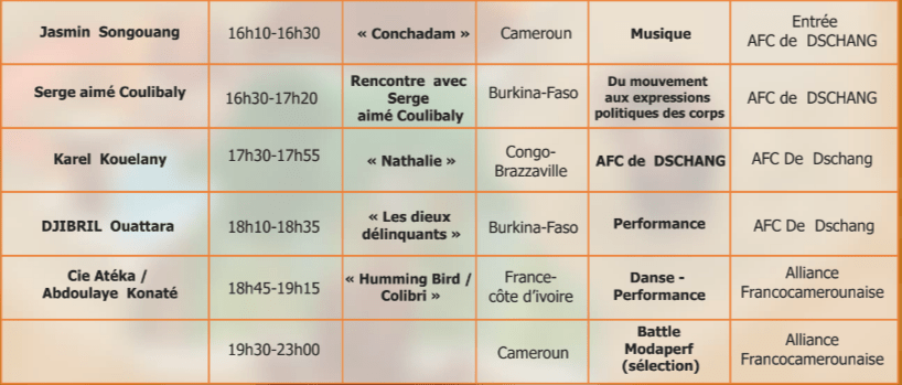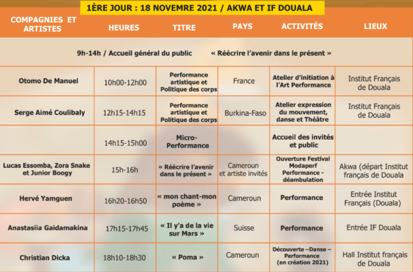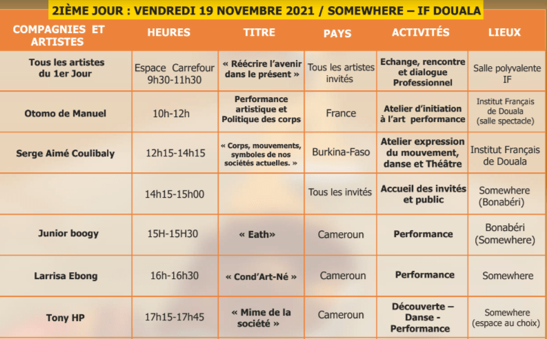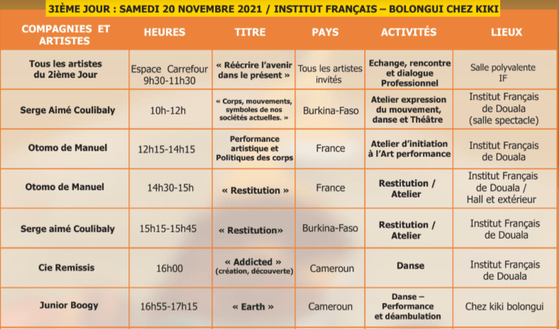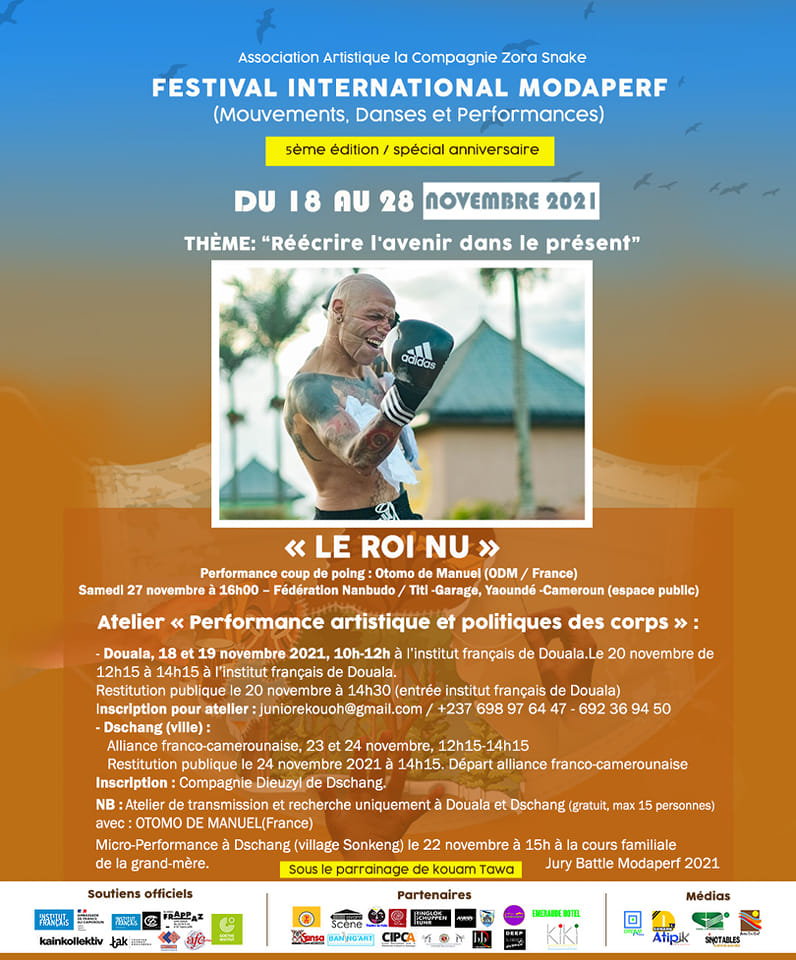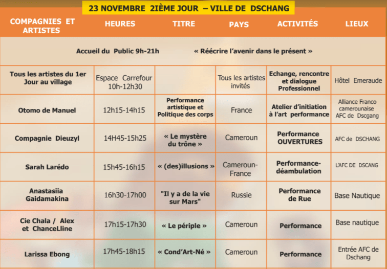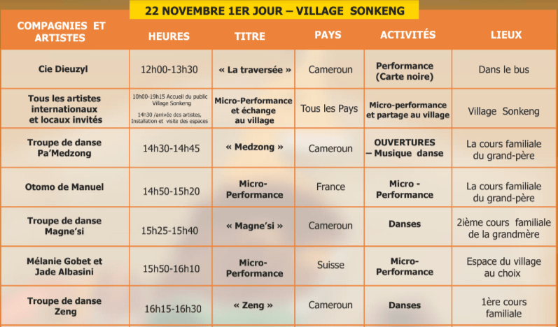 Performances, Installations et Ateliers à Douala du 18 au 20 novembre, à Dschang du 22 au 24 novembre, à Yaoundé du 26 au 28 novembre 2021.