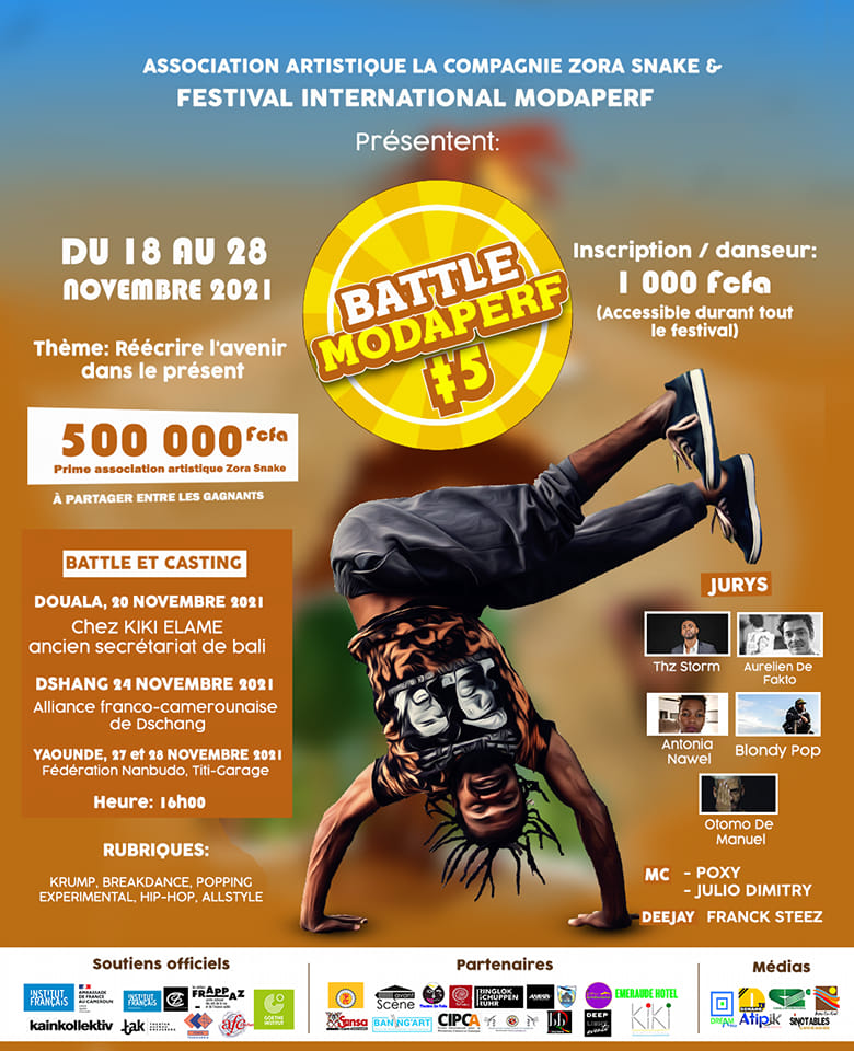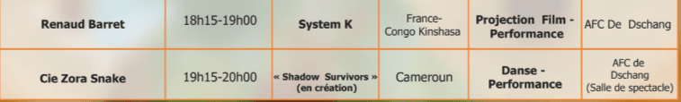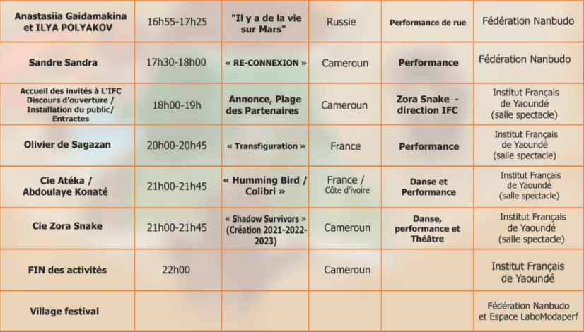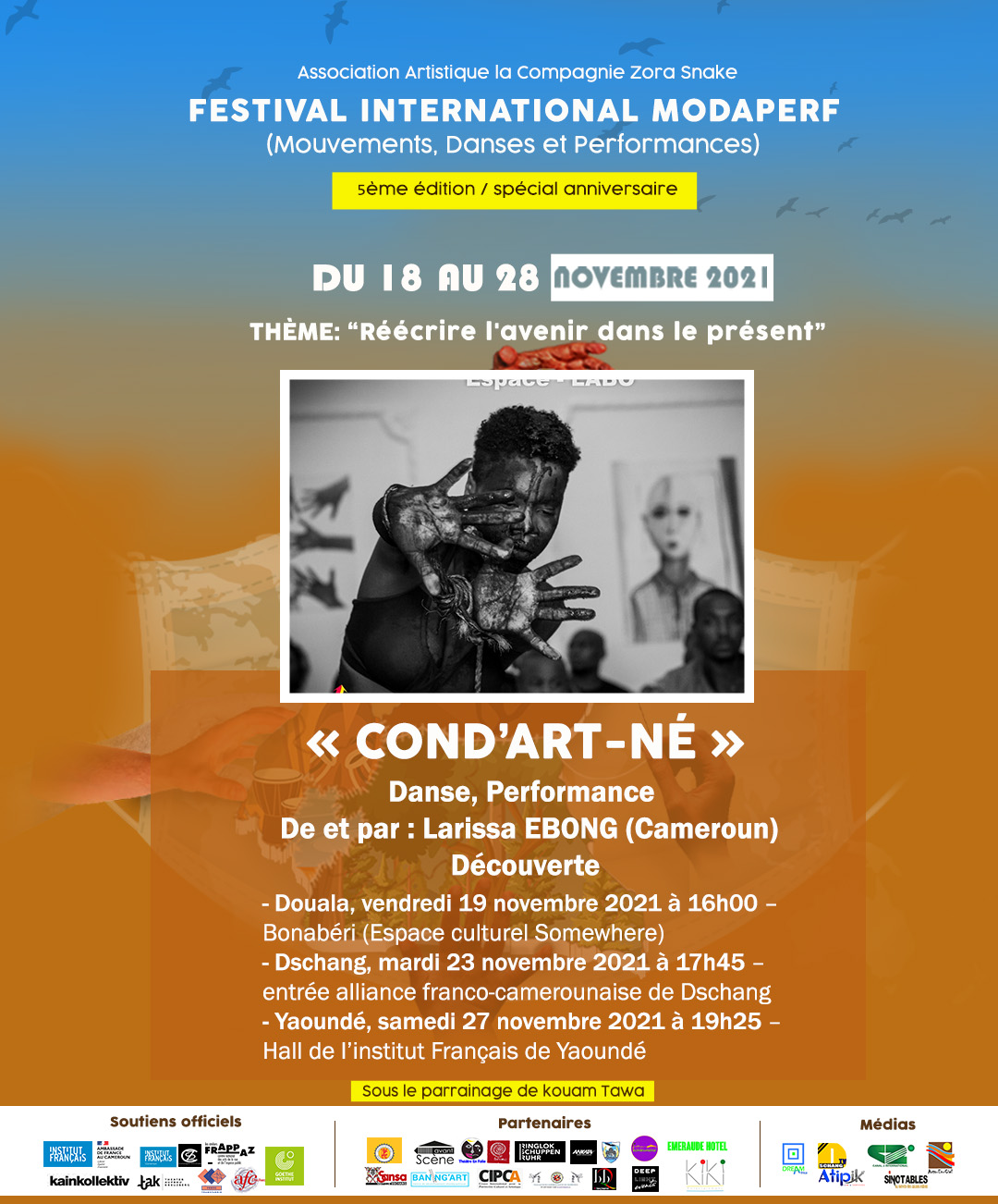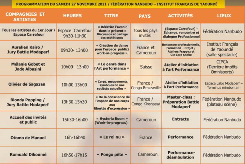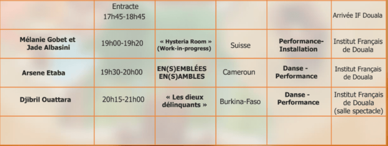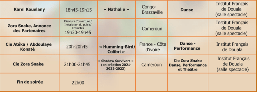 Performances, Installations et Ateliers à Douala du 18 au 20 novembre, à Dschang du 22 au 24 novembre, à Yaoundé du 26 au 28 novembre 2021.