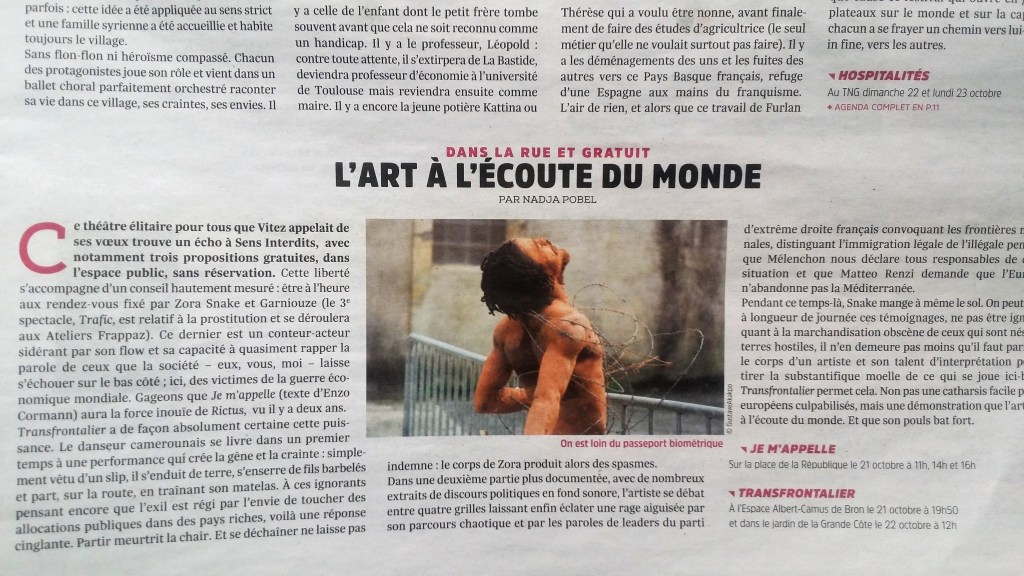 Conçue comme une «enquête artistique», cette performance dansée interroge les frontières réelles et imaginaires, géographiques et mentales, aussi bien en Europe qu’en Afrique. Accompagné de textes et d’une bande-son qui fait entendre des discours politiques sur les migrations, Transfrontalier est un spectacle qui veut «lutter pour bouger les esprits»